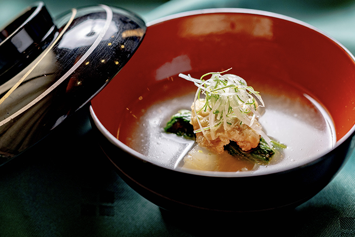 黒峰シャモのガラと骨を昆布や香味野菜と一緒に5時間煮込んでとった和風白湯出汁を使い、出汁に浸けて蒸した玉ねぎと唐揚げにした皮を具材にしたお椀をご用意します。